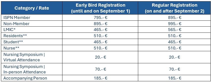 Registration fee includes (except Virtual Nursing Symposium & Accompanying Person categories): Access to all meeting sessions, exhibition & posters area, mini program, access to online CNS Journal, ID badge, coffee breaks, lunches, Welcome Reception, 51st Society Annual Networking Dinner